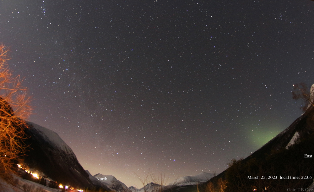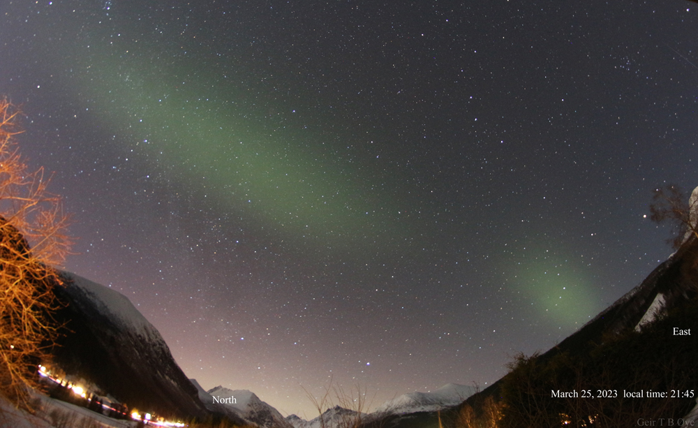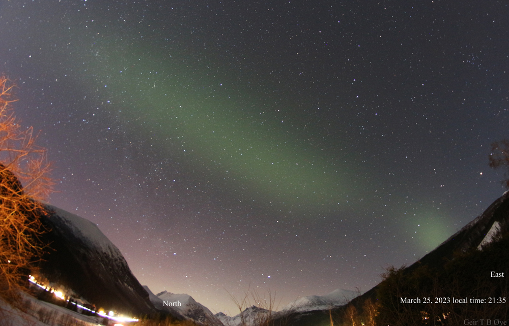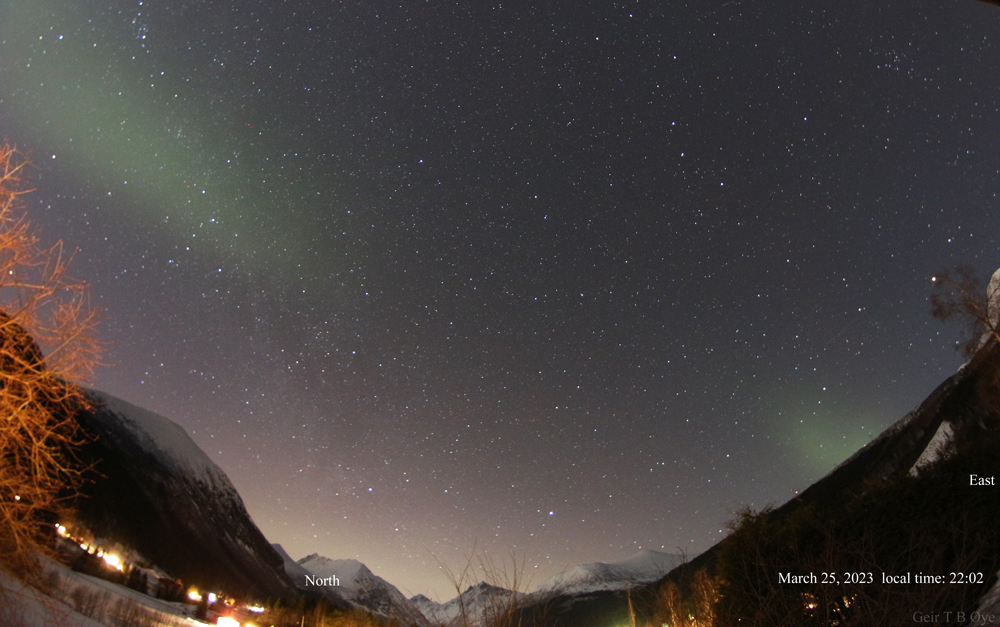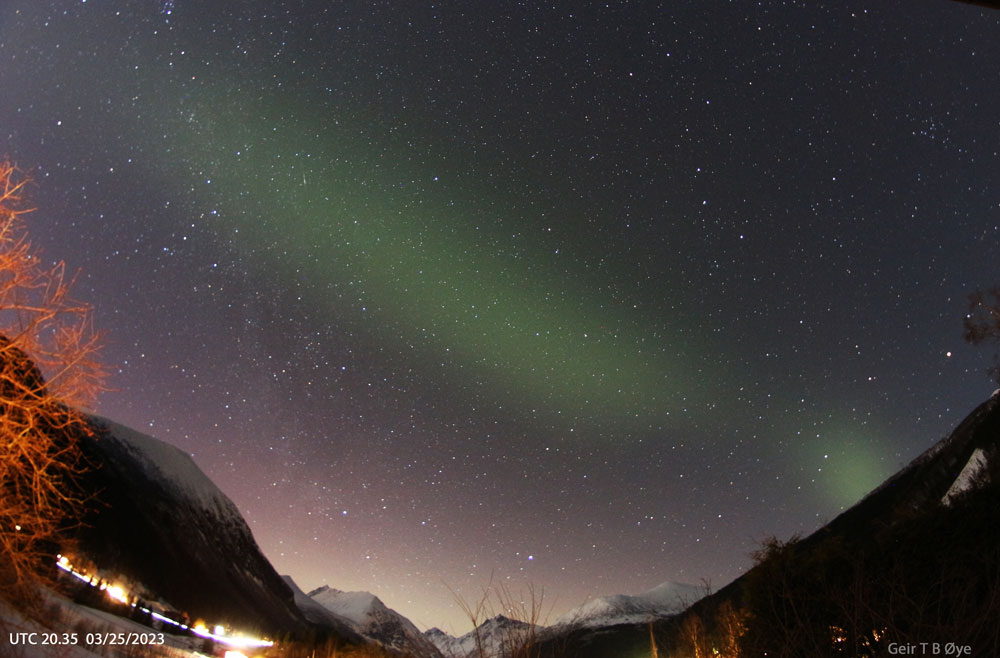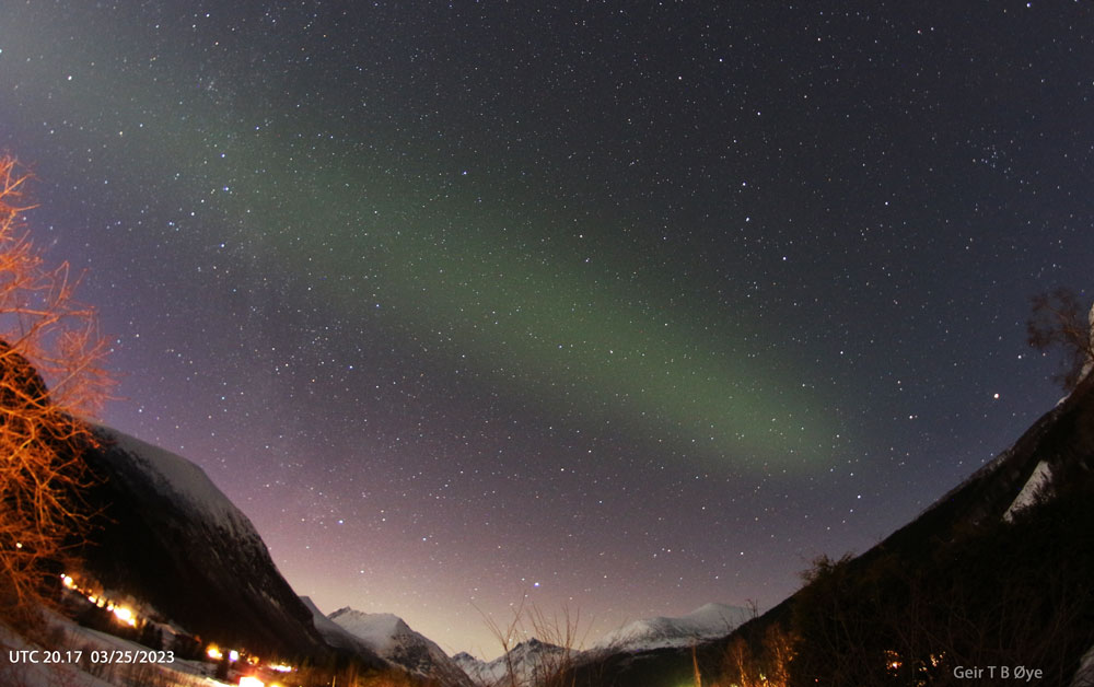 There was an interesting sky show over Ørsta, Norway on March 25, 2023. An auroral activity (related to proton aurora) lasting from about 21.14 to 22.07 local time.