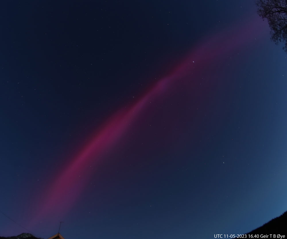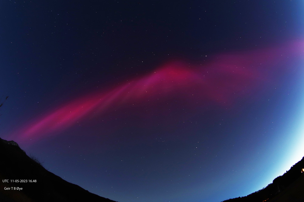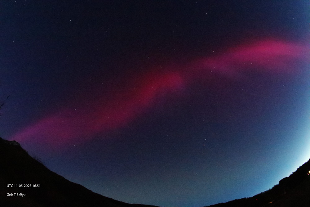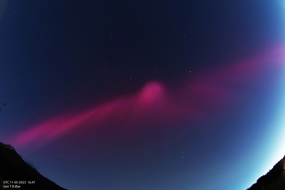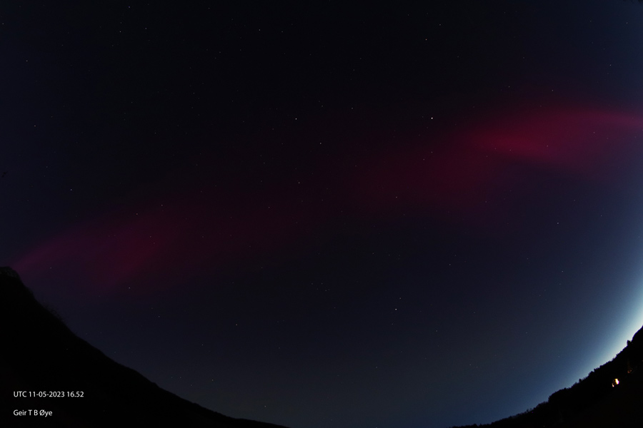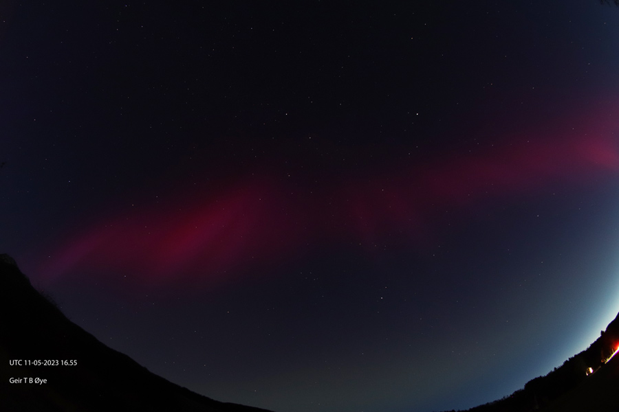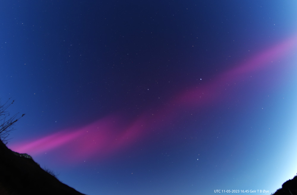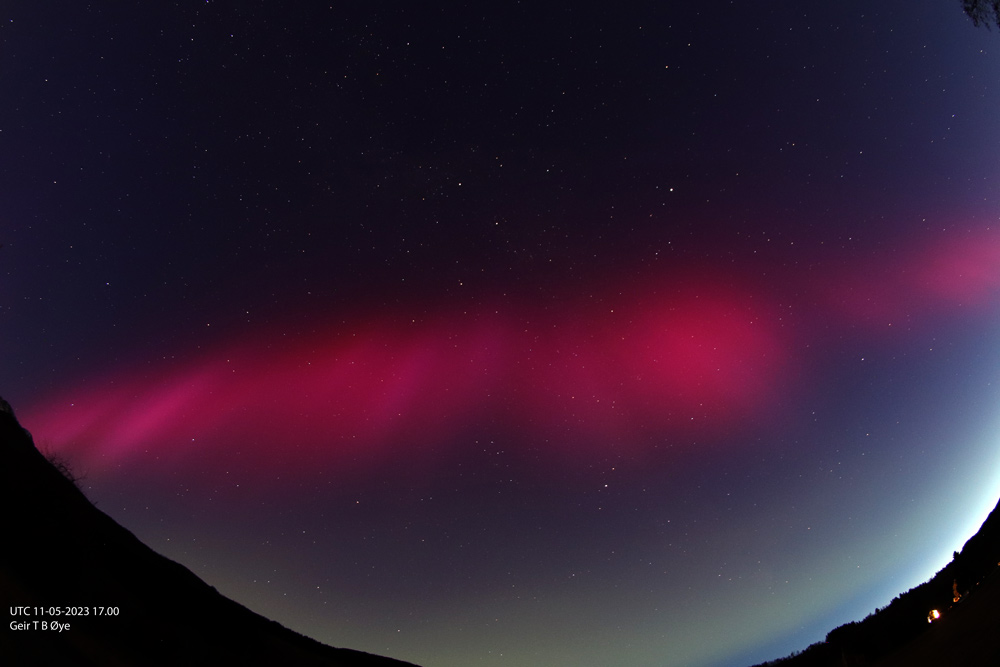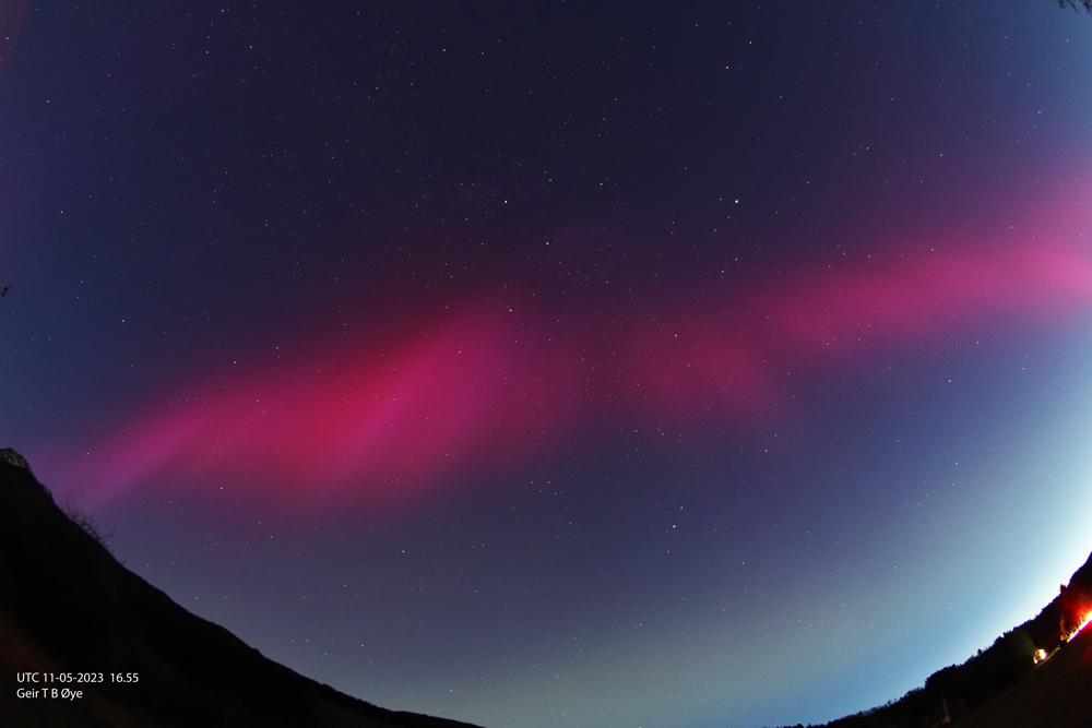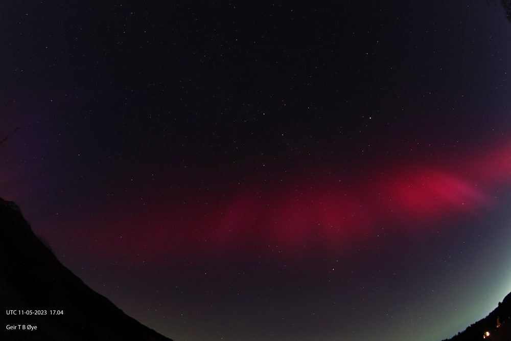 This structured red arc was observed from Ørsta, Norway between 16:40 and 17:08 UTC on November 5, 2023 — roughly 90 minutes before global geomagnetic indicators reached storm levels.