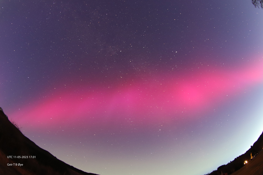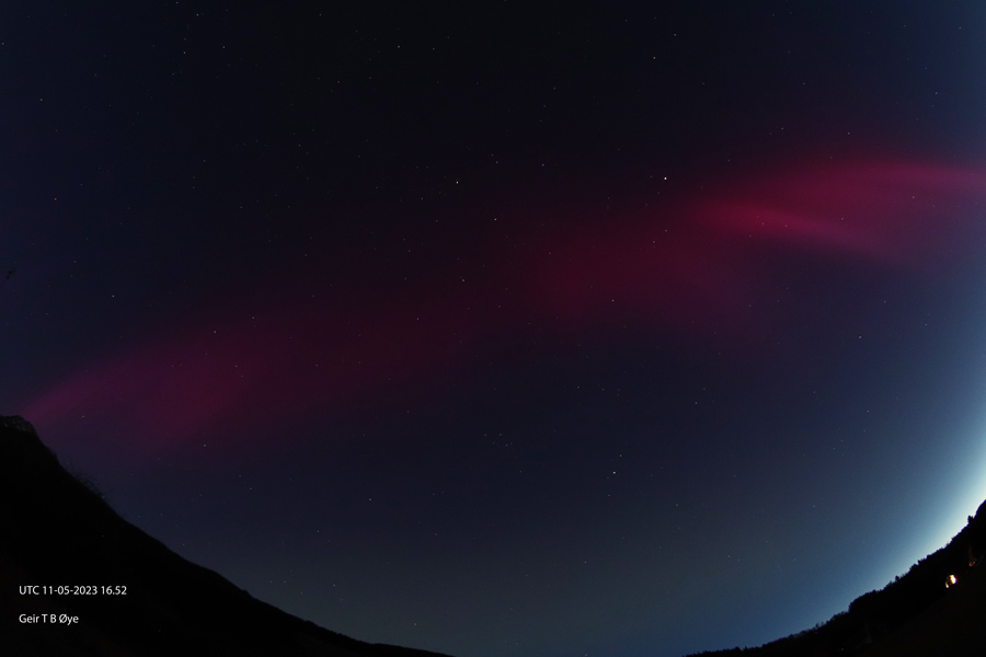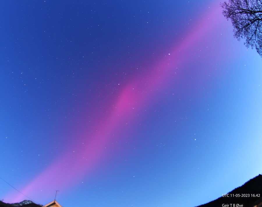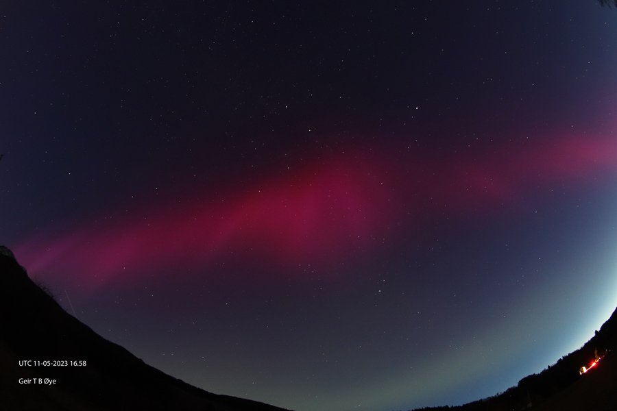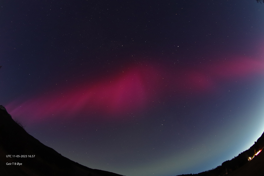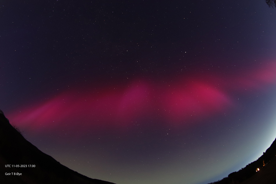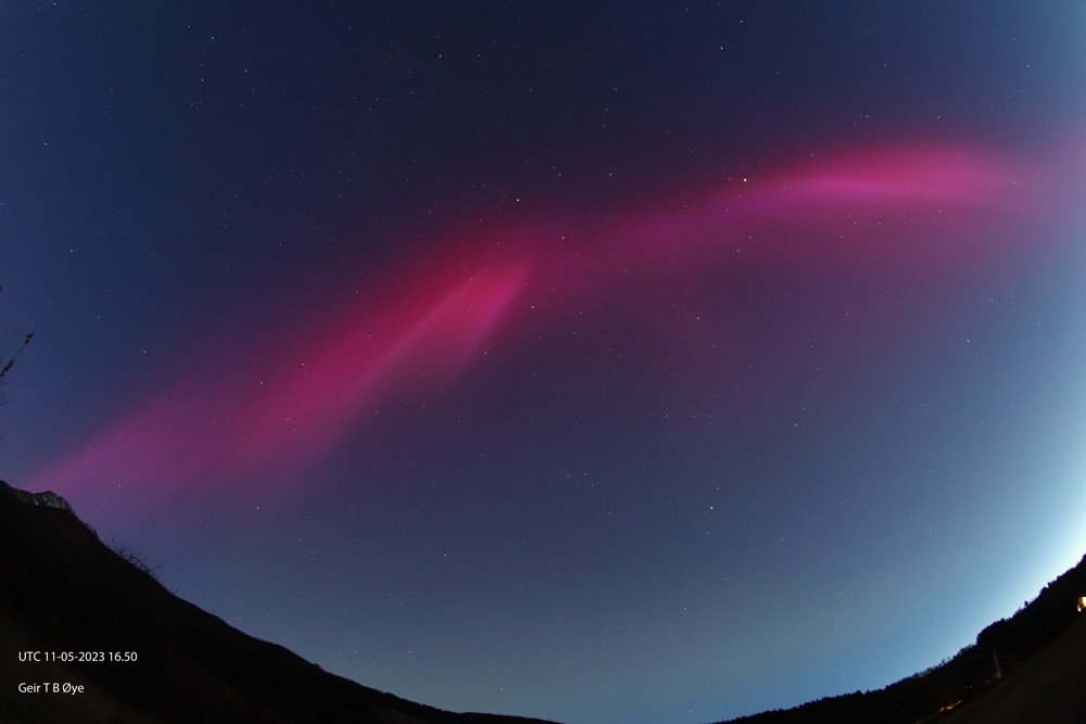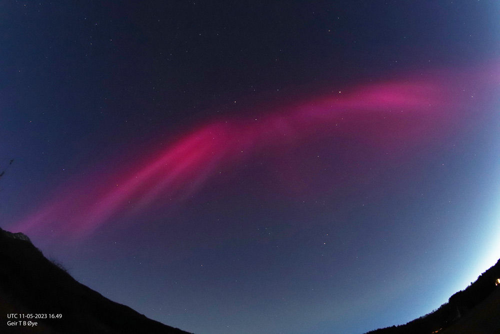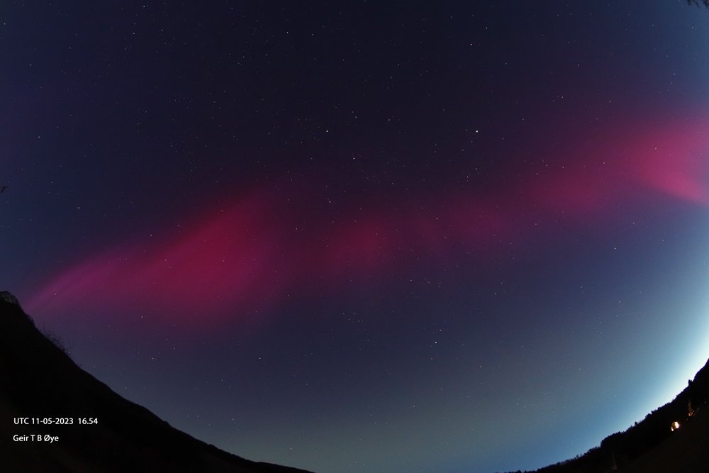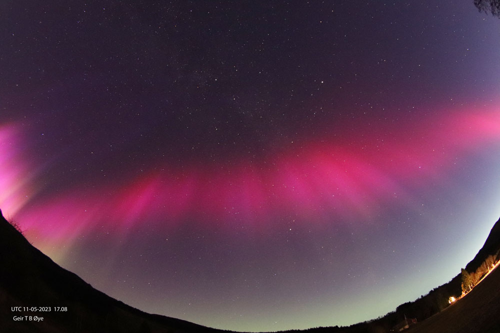 This structured red arc was observed from Ørsta, Norway between 16:40 and 17:08 UTC on November 5, 2023 — roughly 90 minutes before global geomagnetic indicators reached storm levels.