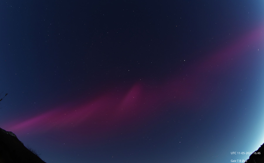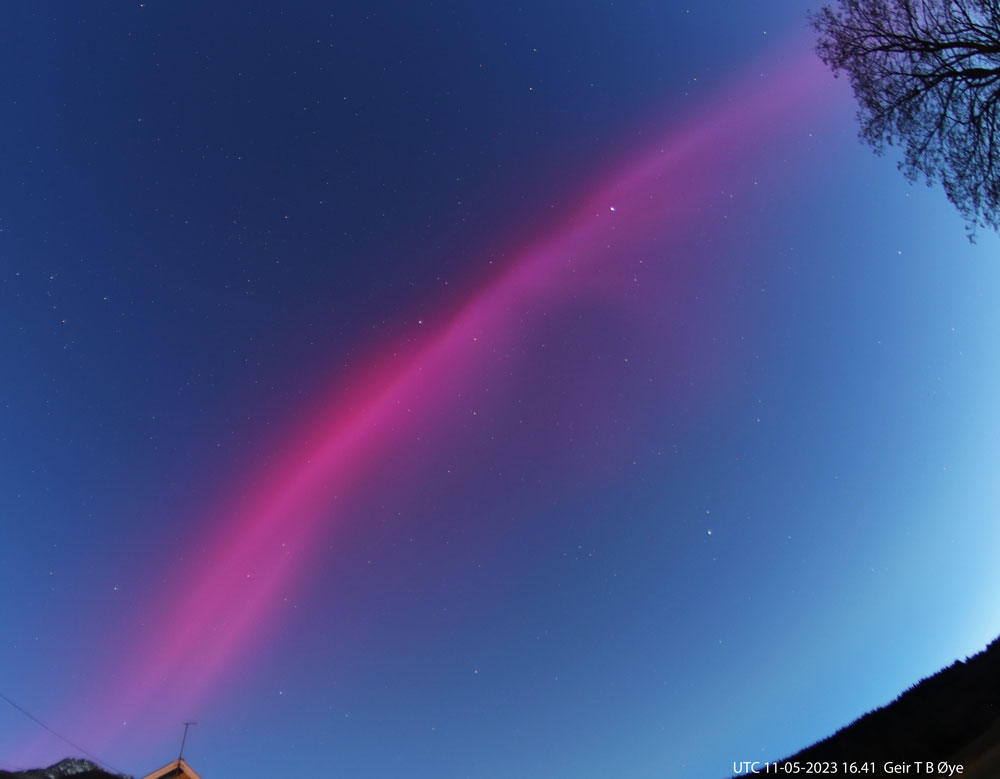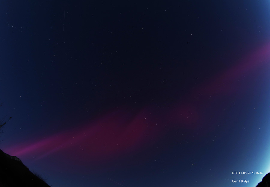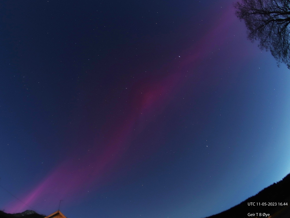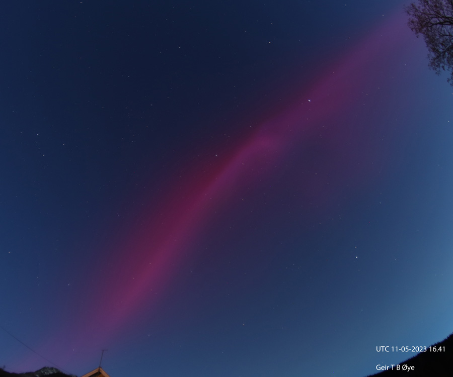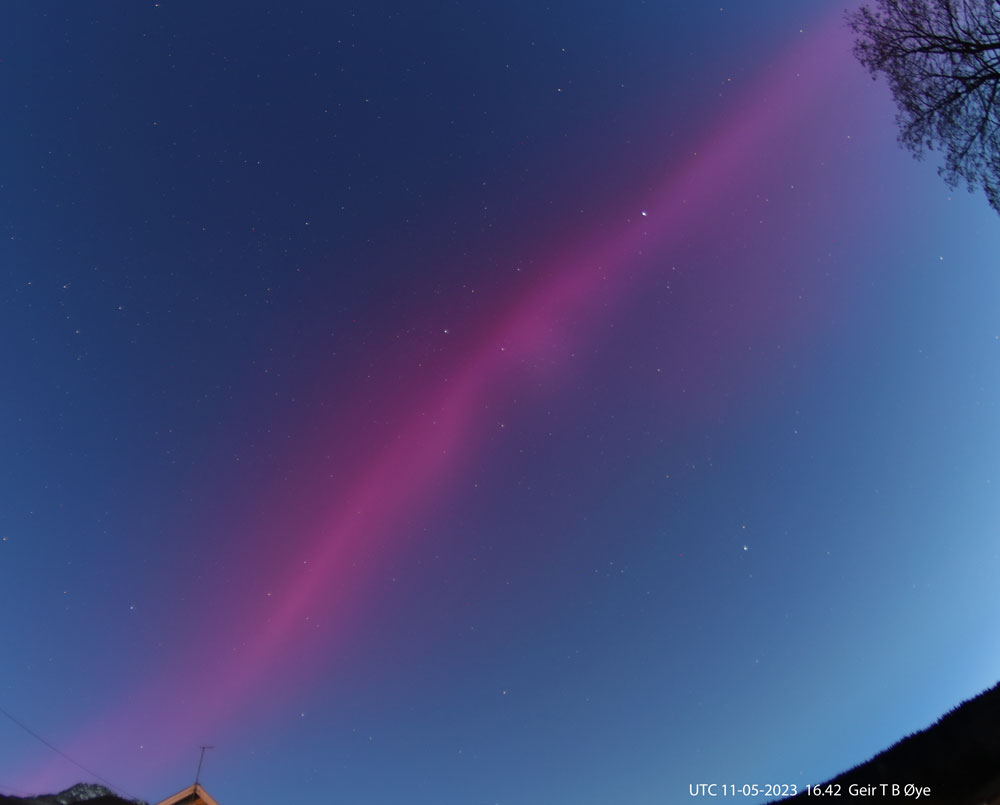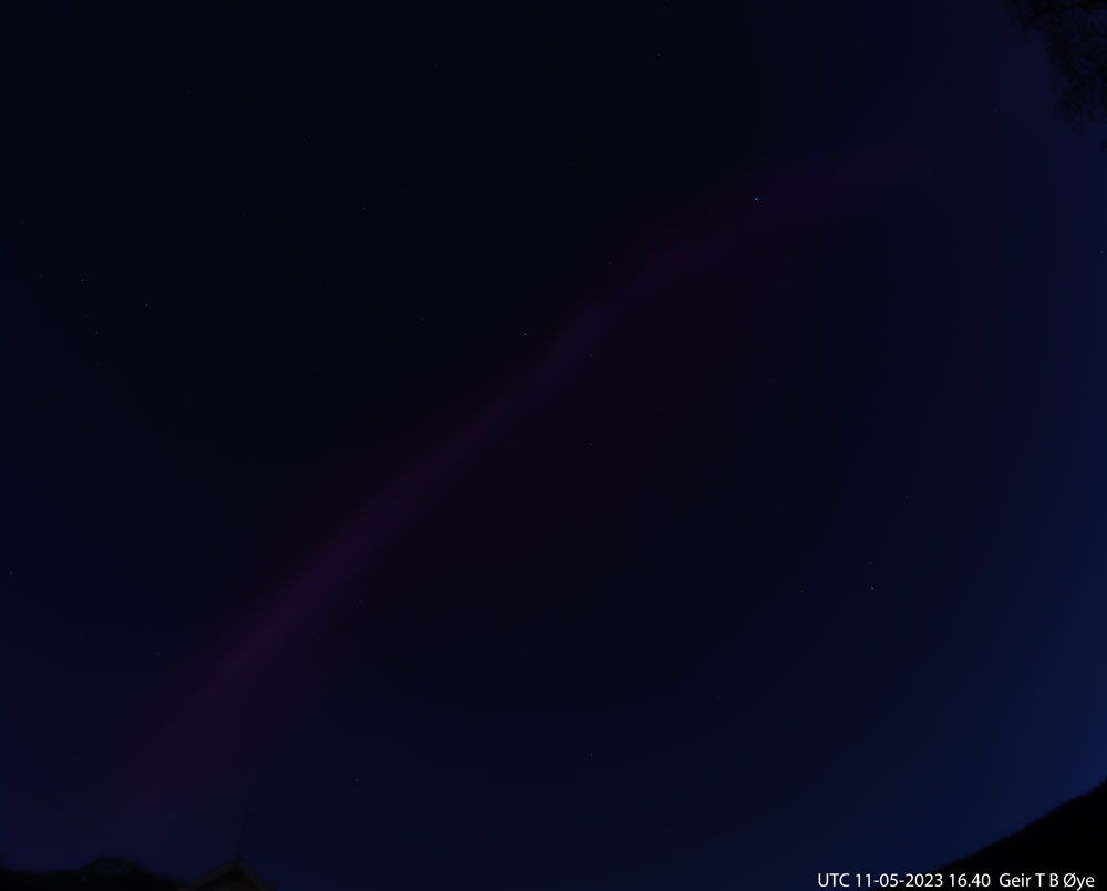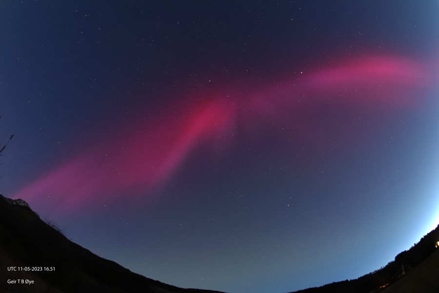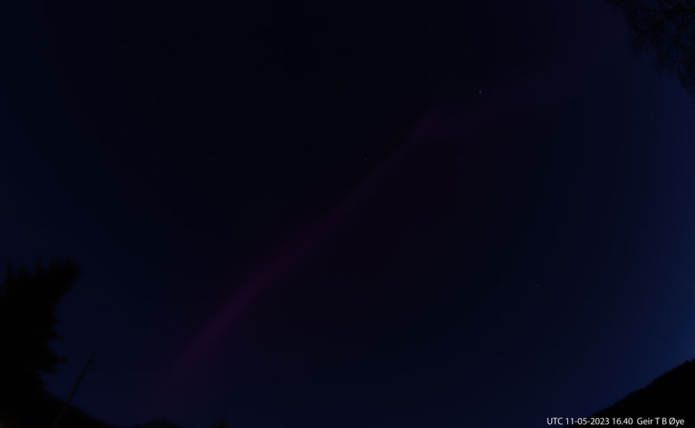 This structured red arc was observed from Ørsta, Norway between 16:40 and 17:08 UTC on November 5, 2023 — roughly 90 minutes before global geomagnetic indicators reached storm levels.