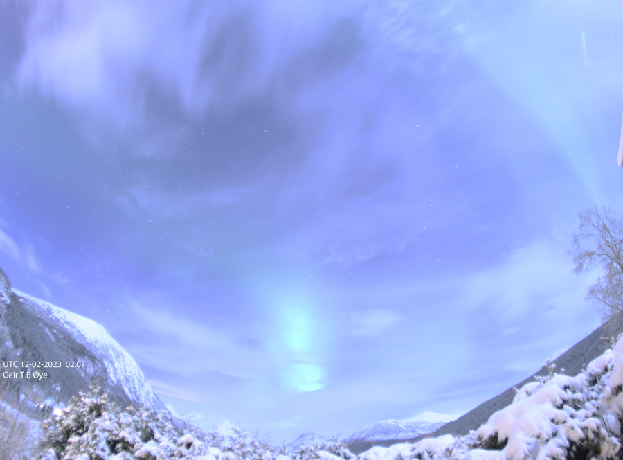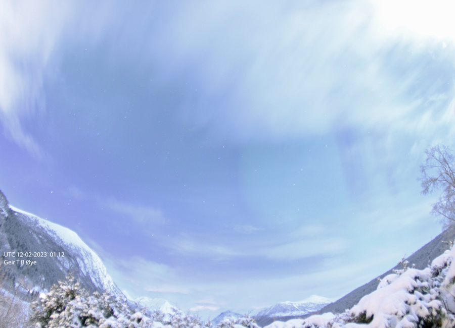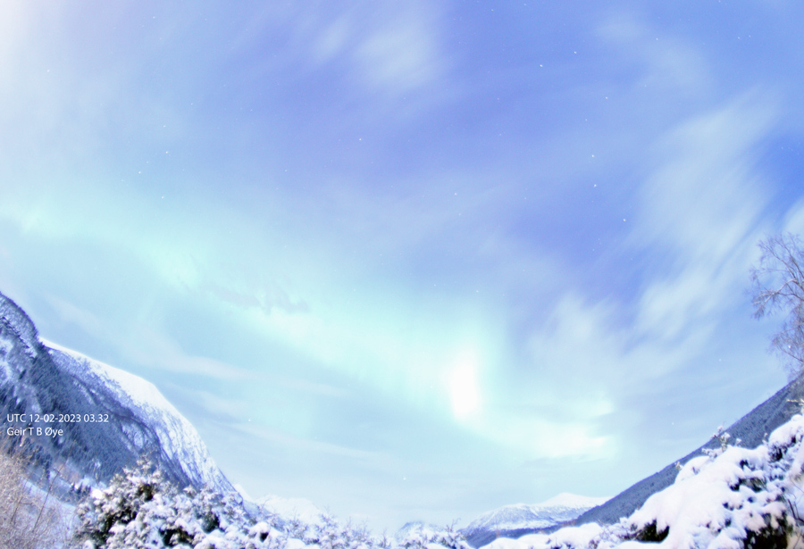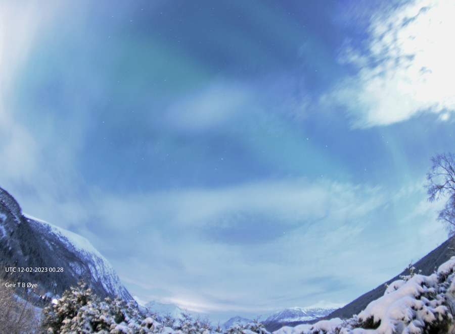 A geomagnetic storm was expected on December 01, 2023. Overcast skies and snowy weather obstructed observations. However, at about UTC 22.30 the sky started to clear up. Here are a few images of the display. Location: Ørsta, Norway. Photo details: Canon 250D, 8 mm fisheye-lens. Timestamp on the images.