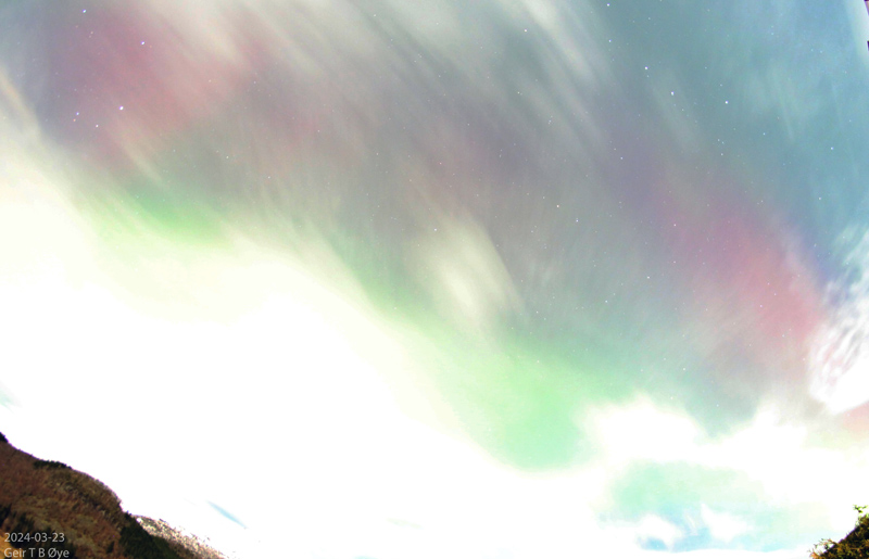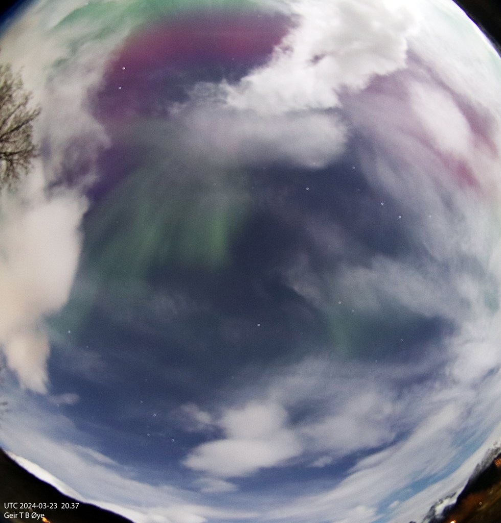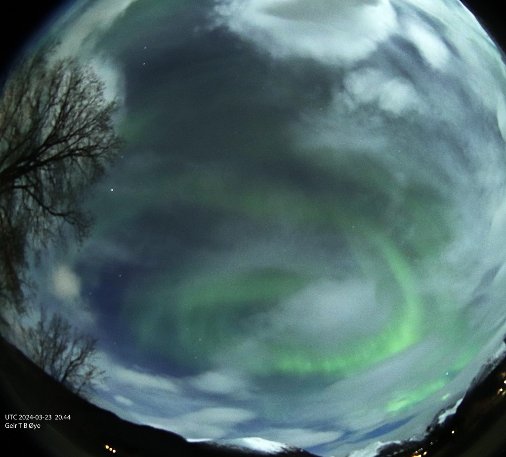 Cloudy, bright moon, and bright auroras in between. A few of images from March 23, 2024. Details: Canon 800D, Meka fisheye-lens.