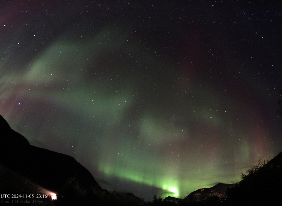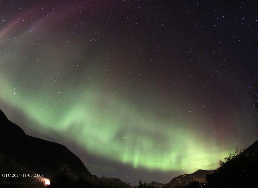 There was a vivid display over the valley on the night of November 5/6, 2024.Details: Canon 650D, Samyang 8mm fisheye-lens. Location: Ørsta, Norway.