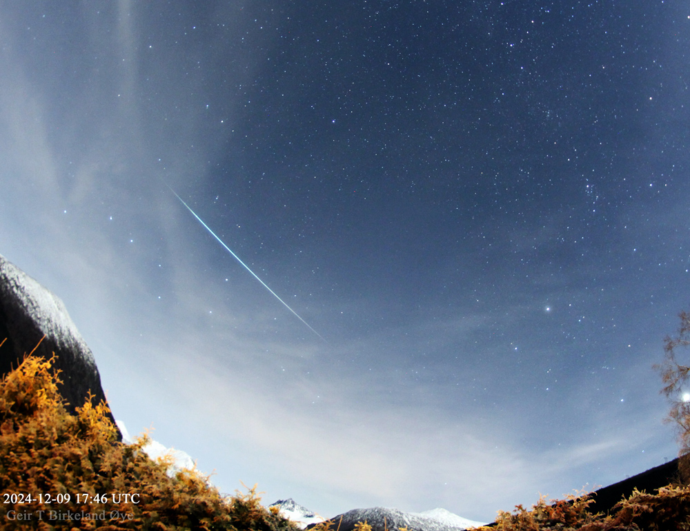 A bright Geminid meteor streaked the sky over Ørsta, Norway at about UTC 17.46 on December 9, 2024. Photo details: Canon 650D, Samyang 8 mm fisheye-lens.