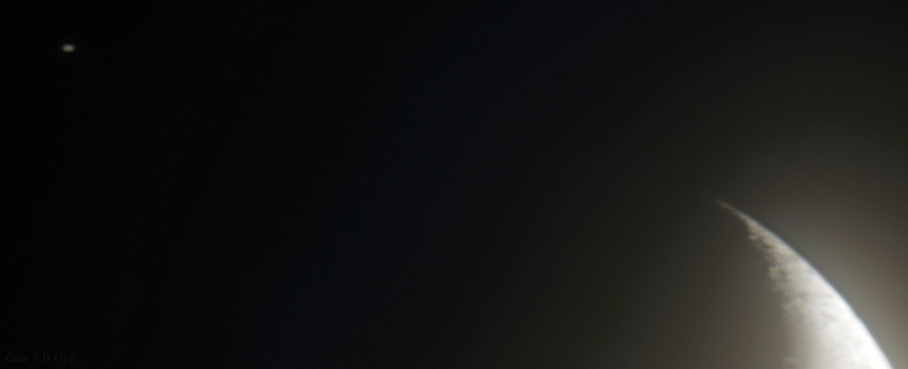 The plan was to observe the Moon occulting Saturn, but shortly before the event clouds came rolling in. Earlier in the afternoon there was a nice corona around the Moon, as it was closing in on Saturn before the occultation. Venus was also nearby, a beautiful set of objects in the twilight. Location: Ørsta, Norway. Photo details: Canon 800D, Canon RP, Sigma 50-500mm lens, Celestron C8.