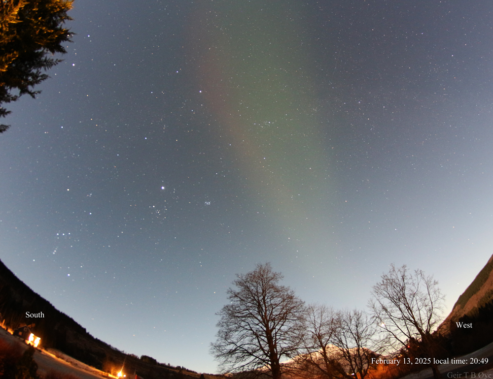 RAGDA. February 13, 2025. Leave a reply Red arc with green diffuse aurora observed over Ørsta, Norway. Photo details: Canon 650D, Fisheye-lens. Share this: Share on X (Opens in new window) X Share on Facebook (Opens in new window) Facebook Like Loading... Related