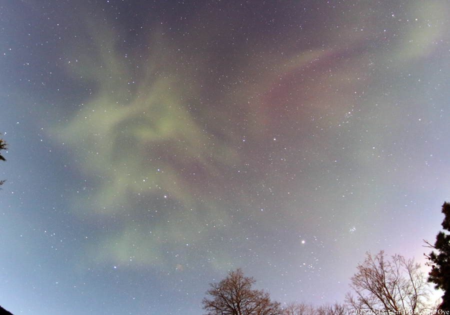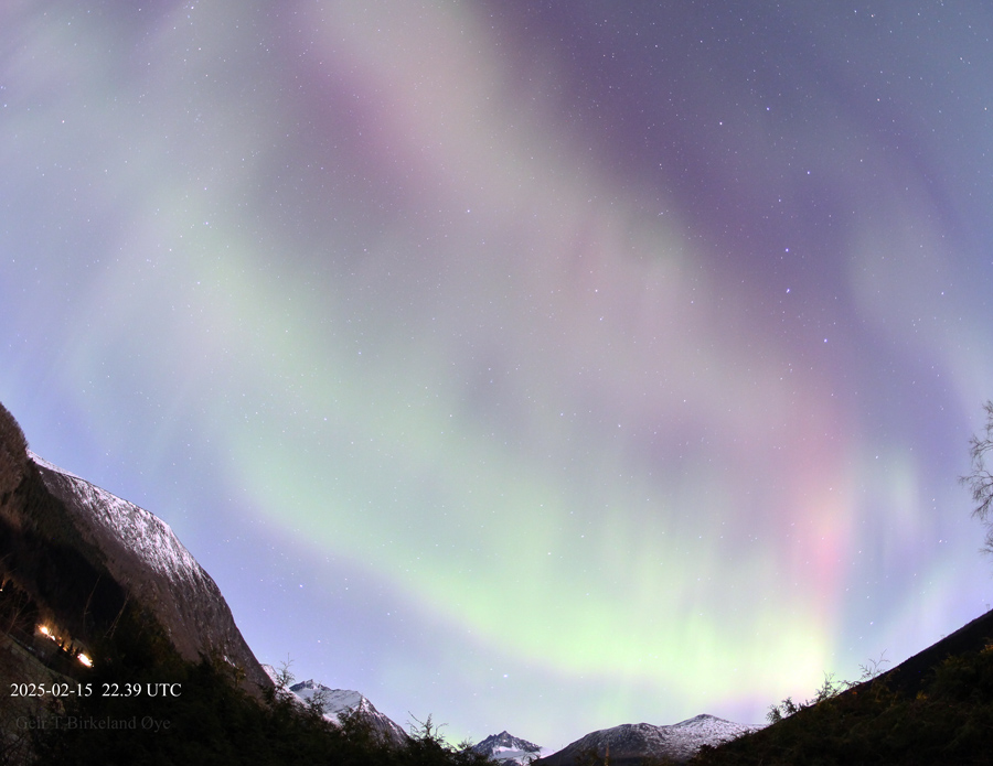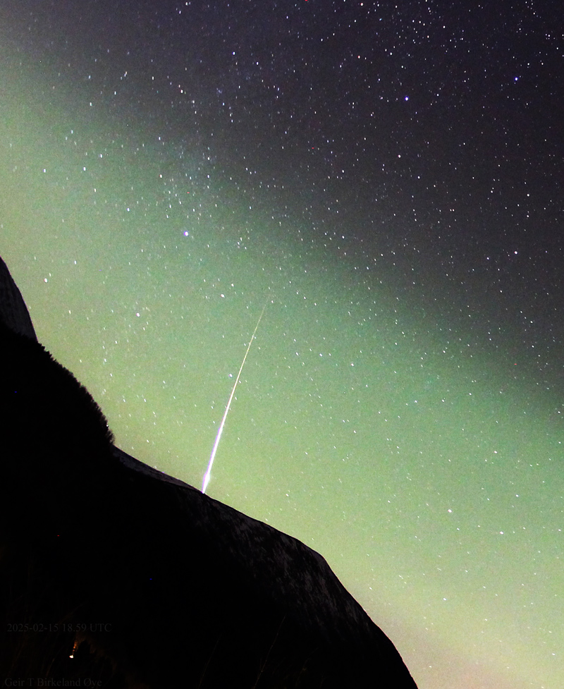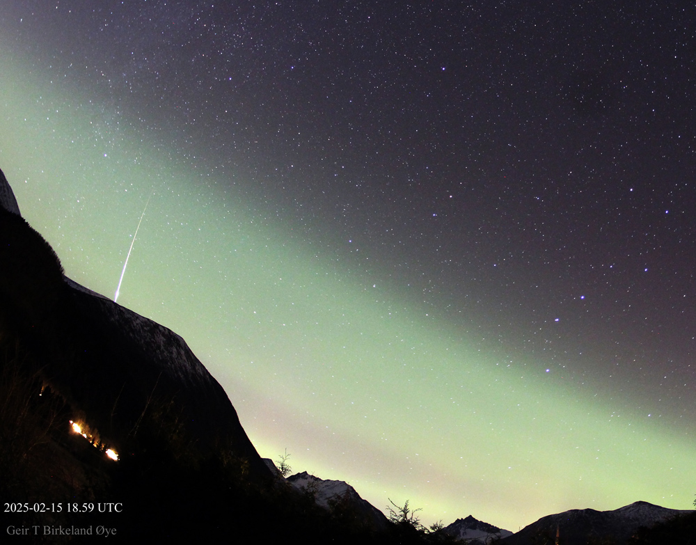 Many nights in a row with auroras. A meteoroid disintegrated at about UTC 18.59, hence a bright meteor was imaged. Location: Ørsta, Norway. Details: 7.5mm fisheye-lens, Canon 650D.