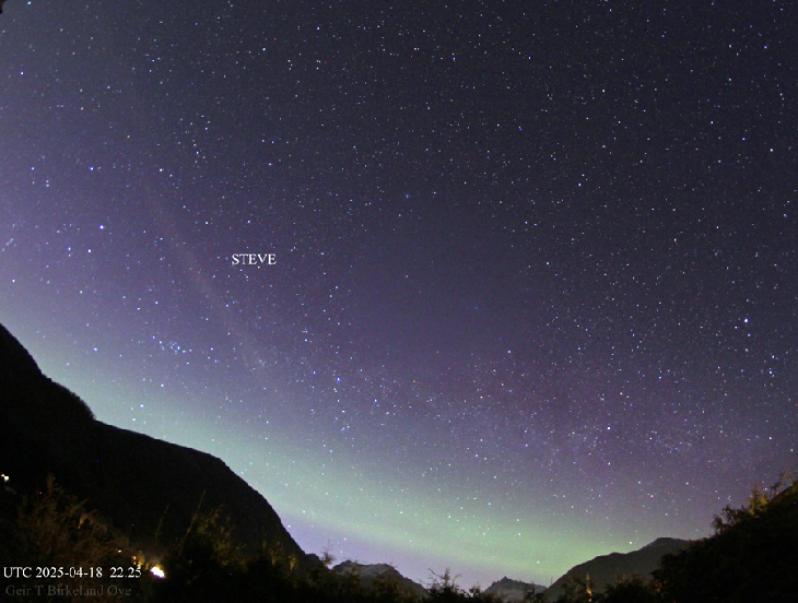 There was a STEVE in the sky on April 18, 2025. It was observed from UTC 22.17 – 22.41. A rather faint display, in a bright sky. The phenomenon was only observed photographically. Photo details: Canon 650D, Samyang 8 mm fisheye-lens.