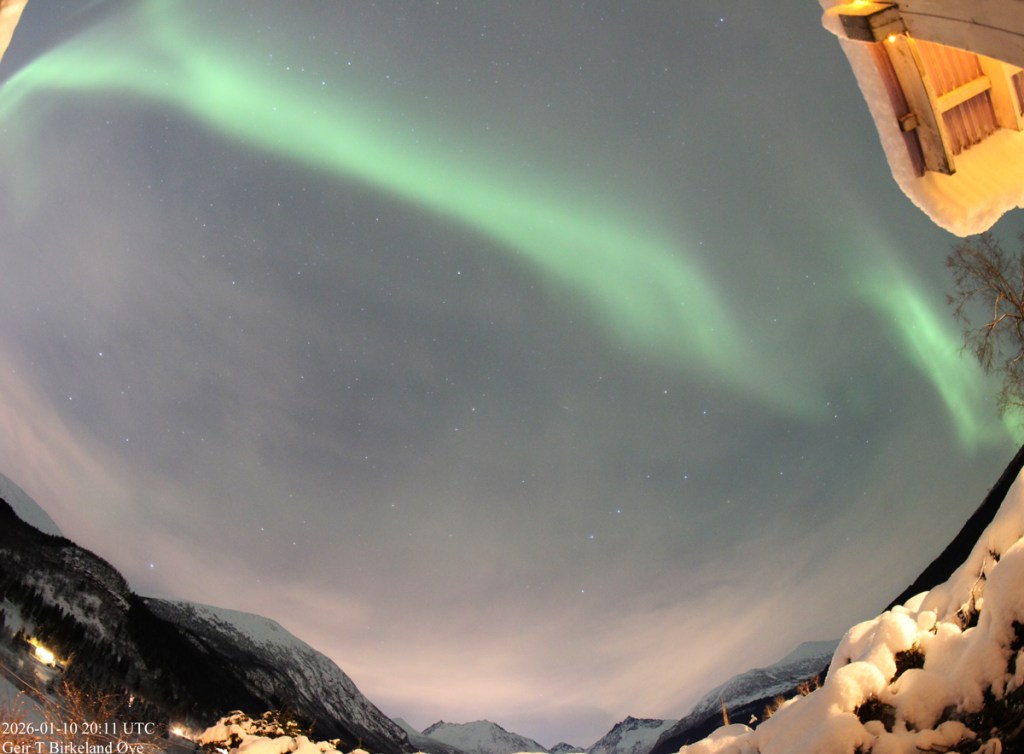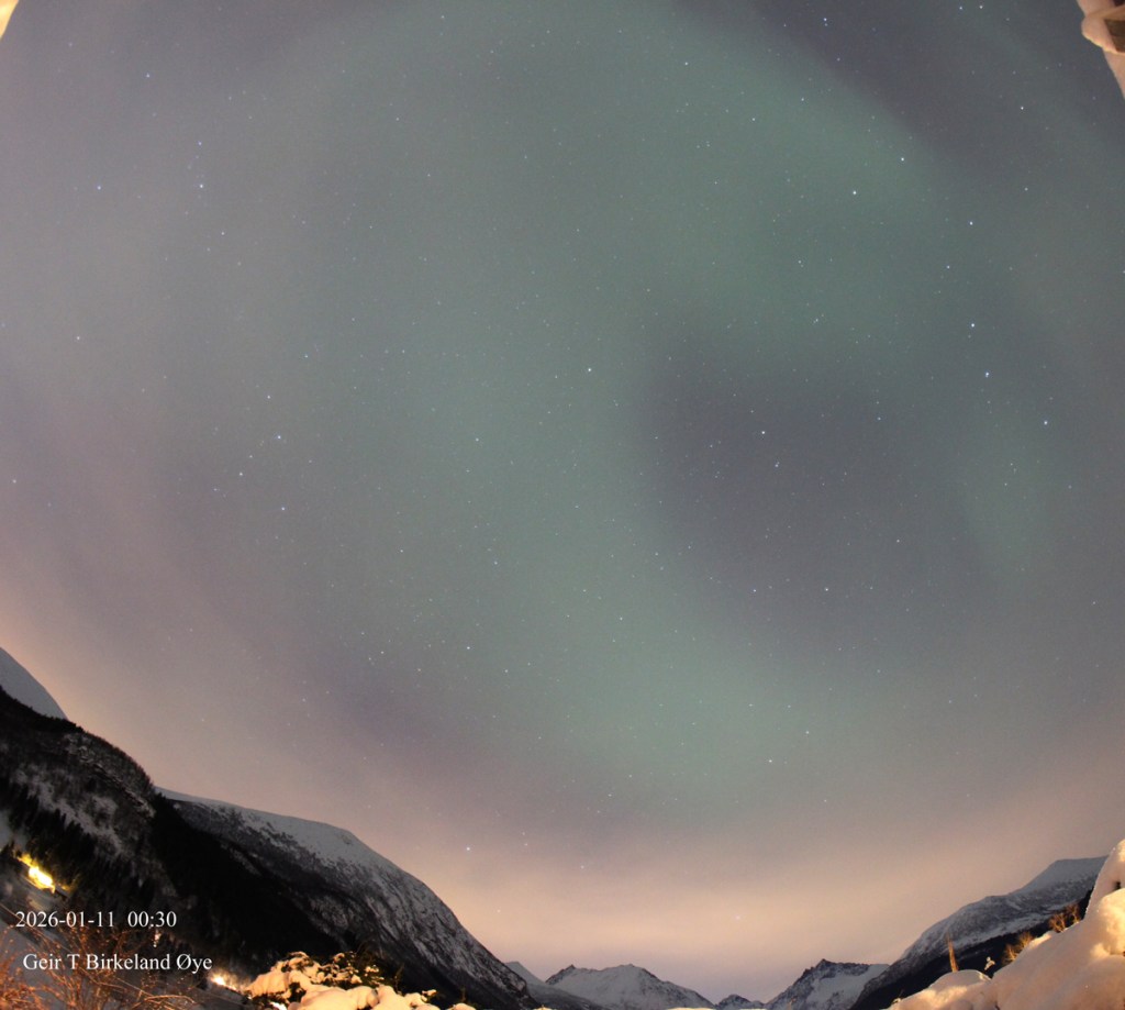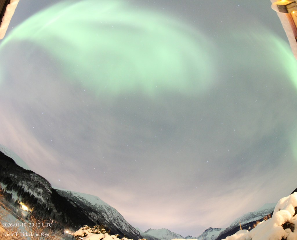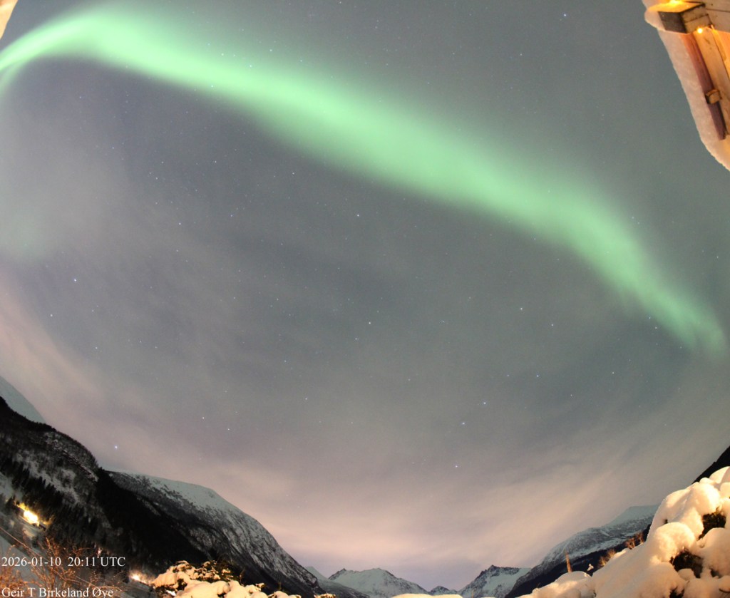 Auroral Dunes. On 10 January 2026, around 19:55 local time (18:55 UTC) and for approximately 16 minutes, I observed a thin, diffuse green aurora showing clear horizontal ripple‑like structures. Thin clouds were present in the foreground and interfered at times, making interpretation more challenging both visually and photographically. Despite the cloud interference, the structures remained stable across several exposures — 20:01, 20:04, and 20:07 local time (19:01, 19:04, 19:07 UTC) — and the pattern is consistent with previously documented auroral dunes. Details: Canon 650D, 8mm fisheye-lens, Iso:1600, various exposure times.