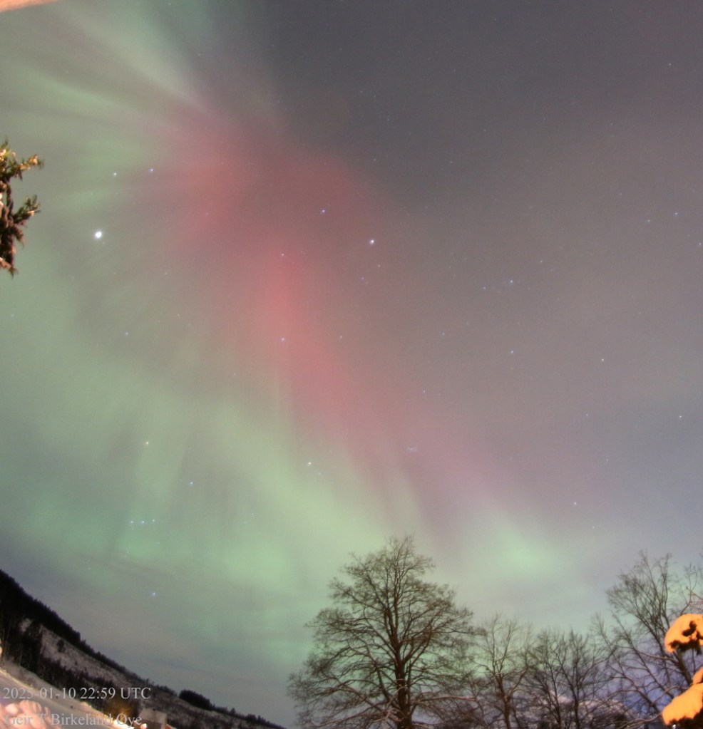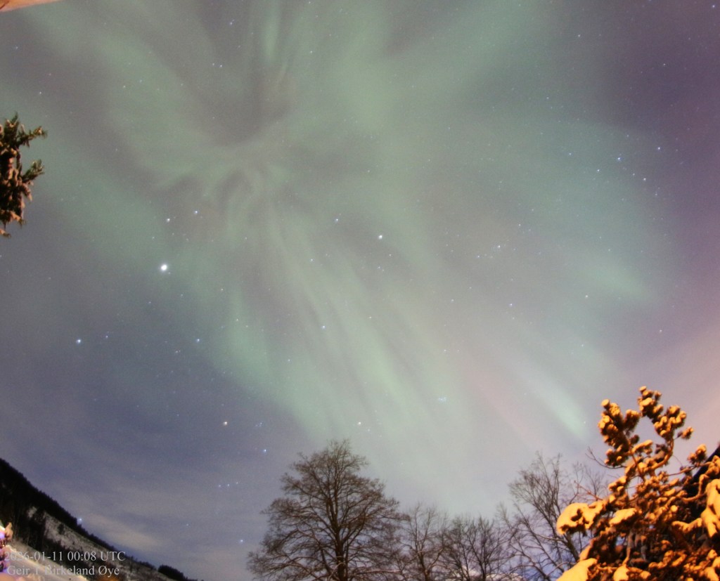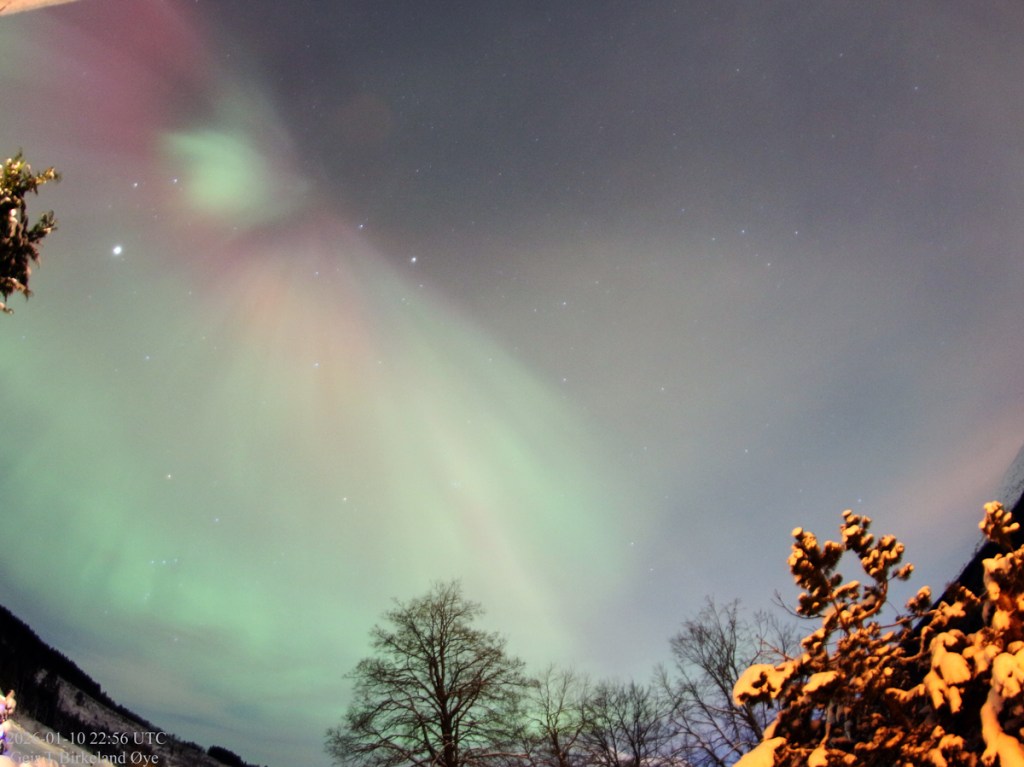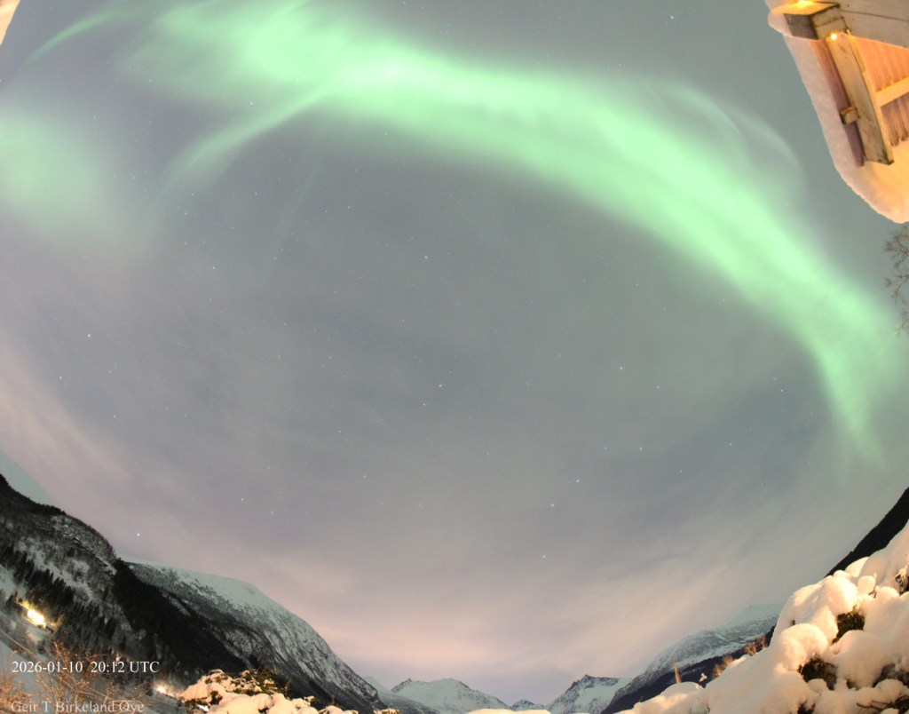 Auroral Dunes. On 10 January 2026, around 19:55 local time (18:55 UTC) and for approximately 16 minutes, I observed a thin, diffuse green aurora showing clear horizontal ripple‑like structures. Thin clouds were present in the foreground and interfered at times, making interpretation more challenging both visually and photographically. Despite the cloud interference, the structures remained stable across several exposures — 20:01, 20:04, and 20:07 local time (19:01, 19:04, 19:07 UTC) — and the pattern is consistent with previously documented auroral dunes. Details: Canon 650D, 8mm fisheye-lens, Iso:1600, various exposure times.