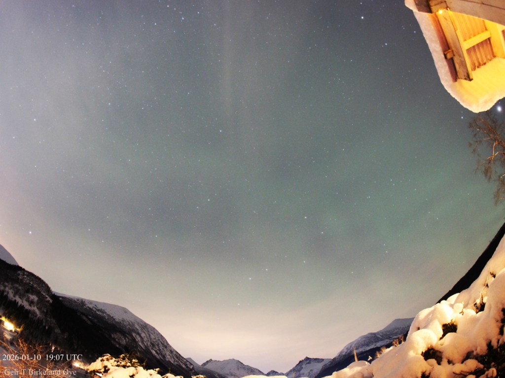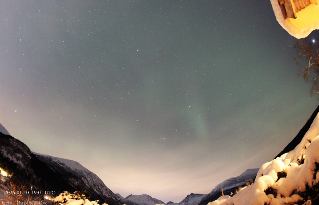 Auroral Dunes. On 10 January 2026, around 19:55 local time (18:55 UTC) and for approximately 16 minutes, I observed a thin, diffuse green aurora showing clear horizontal ripple‑like structures. Thin clouds were present in the foreground and interfered at times, making interpretation more challenging both visually and photographically. Despite the cloud interference, the structures remained stable across several exposures — 20:01, 20:04, and 20:07 local time (19:01, 19:04, 19:07 UTC) — and the pattern is consistent with previously documented auroral dunes. Details: Canon 650D, 8mm fisheye-lens, Iso:1600, various exposure times.