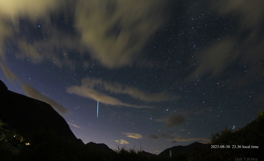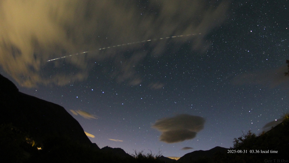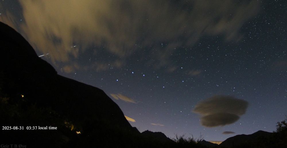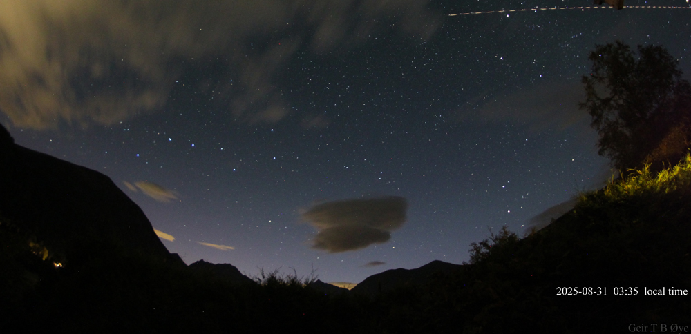 This observation took place at 03:35 – 03:37 local time on August 31, 2025. Ørsta, Norway. Photo details: Canon 650D, Samyang 8mm fisheye-lens, Iso:1600, exposure time: 39.9 seconds.