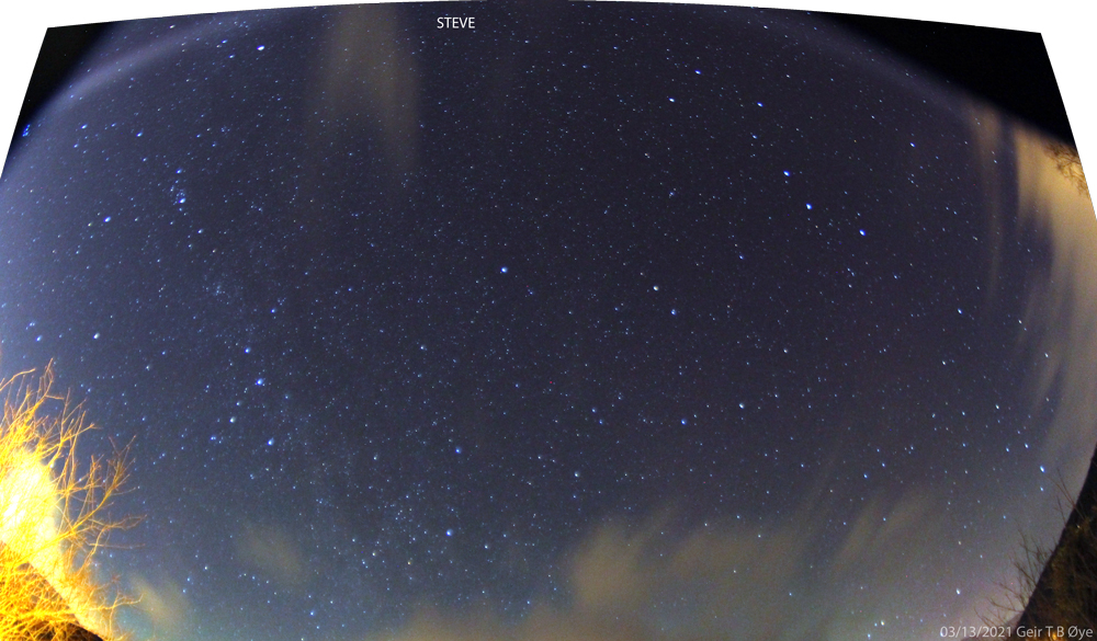 Beautiful aurora borealis on the evening of March 13/14, 2021. Interestingly, STEVE was also present. The feeble arc emerged from the eastern sky, and was present from 21.34 to 21.59 local time. (UTC 20.34 to 20.59). As seen/photographed from my vantage point. Ørsta, Norway.(62.18 Lat. N). Photo details: Canon 1300D, Samyang 8 mm fisheye-lens, iso: 1600, various exposure times.