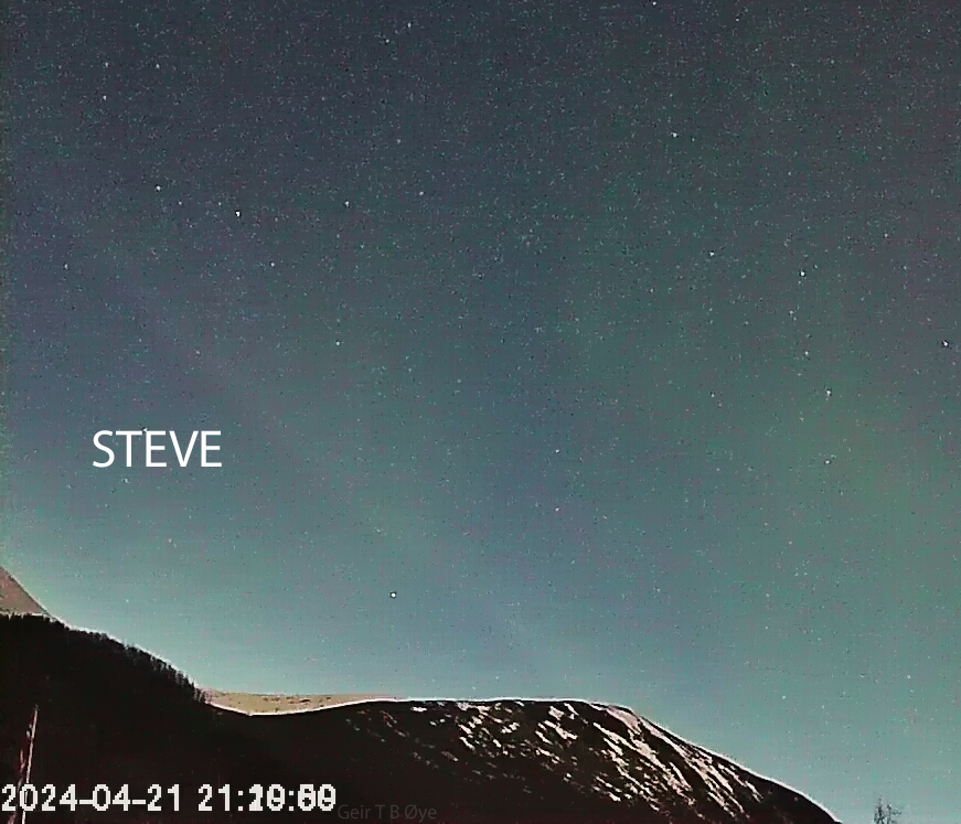 There was a brief instance of auroral activity on April 21. Not easily seen or photographed because of a bright sky. Interestingly, the contrail like phenomenon STEVE was observed from about UTC 21.02 to 21.34.