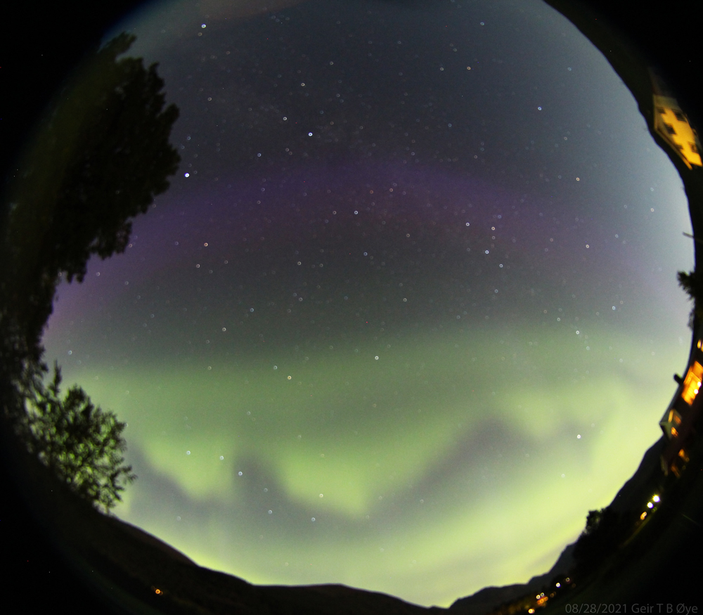 At around midnight August 27/28 I noticed auroral activity. The easily seen green aurora covered much of the sky. A more faint pinkish arc was also photographed.